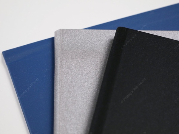 Les albums Rainbow sont insérés dans une couverture rigide habillée d’un tissu métallisé, proposée en plusieurs coloris : noir, bleu et gris. Cette finition confère à l’album une identité visuelle forte et une excellente tenue dans le temps.
